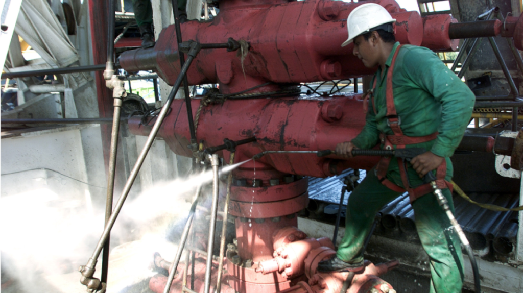 Un trabajador petrolero de la empresa mexicana Pemex realiza labores de limpieza en un yacimiento.