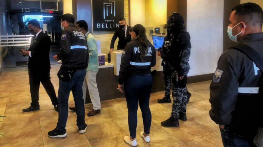 Policías y funcionarios de la Fiscalía durante un allanamiento en Quito, el 2 de septiembre de 2021, por el caso que involucra al hijo del alcalde de Quito, Sebastián Yunda.