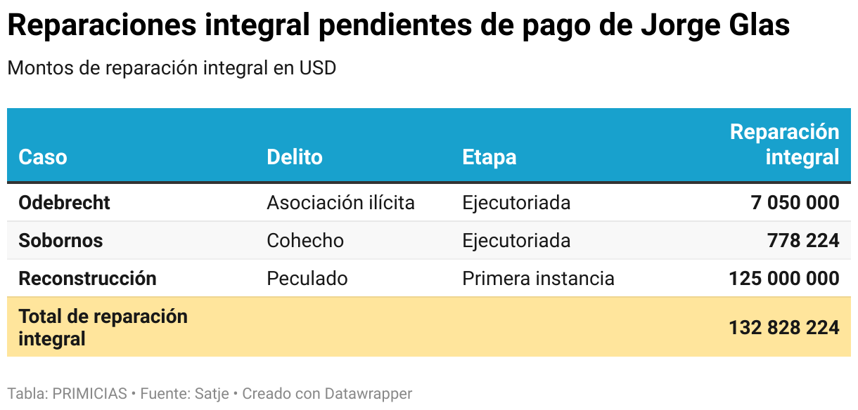 En total, entre los tres casos, la deuda de Glas ya asciende a USD 132,8 millones, aunque la mayoría de ese monto se refiere al caso Reconstrucción de Manabí, cuya sentencia todavía no está en firme.